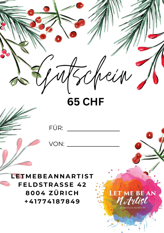 Gutschein Letmebeannartist. Ein tolles Weihnachtsgeschenk zum Jahresende. Once the payment is made, you will receive an email with Gutschein and the name of the person you would like to give the gift to. It can be used for any workshop held at the Letmebeannartist on Feldstrasse 42. 8004 Zürich. For more information or questions please contact Natalia Wyss +41774187849 / natalia@letmebeannartist.com